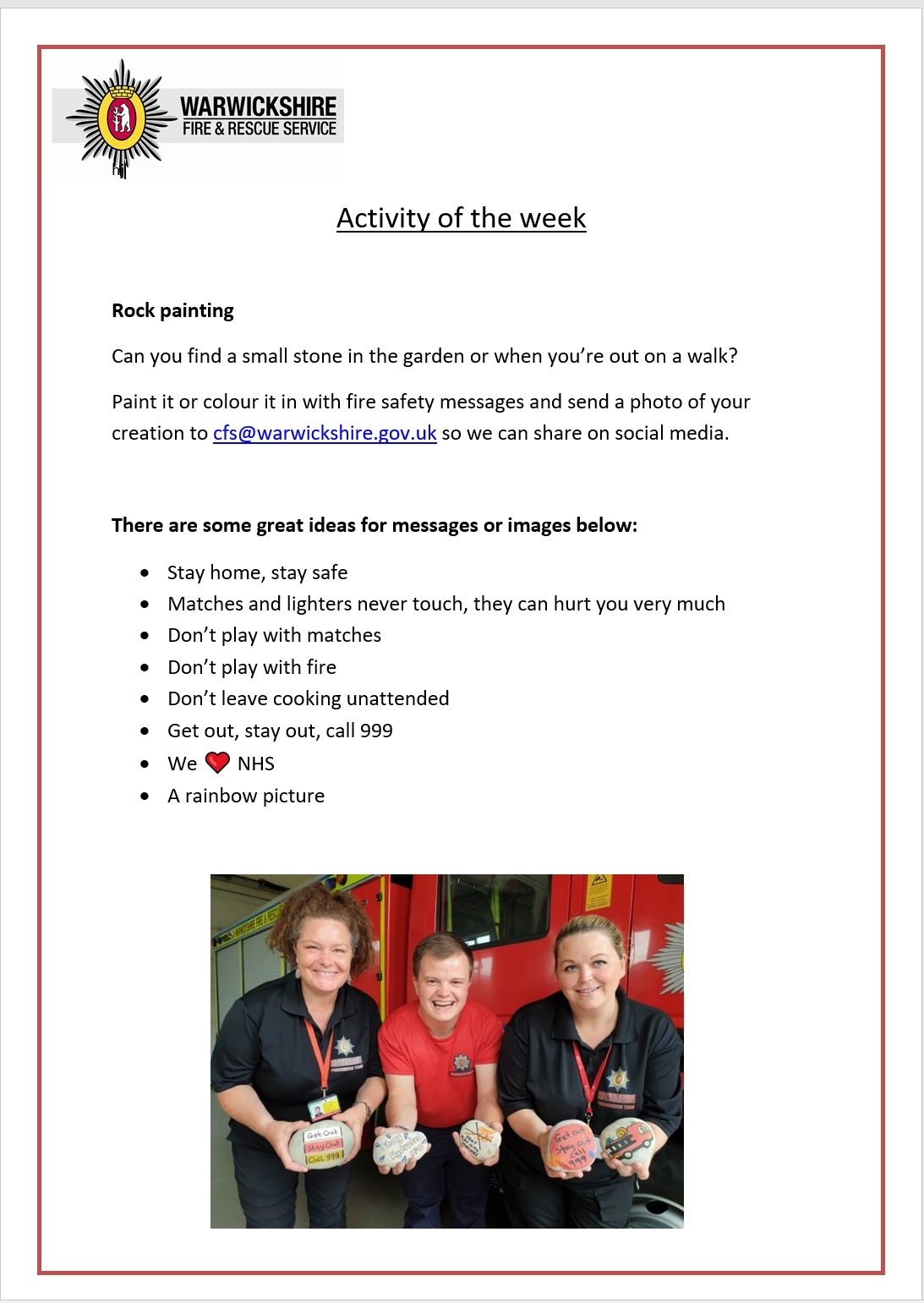 Warwickshire Fire and Rescue Service are running activities each week for children to take part in on both Facebook and Twitter. Last week was salt dough shapes and this week they've set the challenge for anyone who would like to have a go at rock painting.