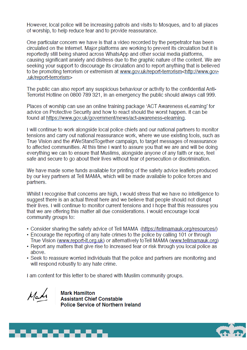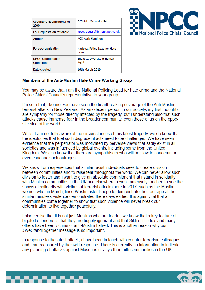 We have been asked to share the attached letter from ACC Mark Hamilton (National Policing Lead for hate crime and the National Police Chiefs’ Council representative) that was sent to members of the Anti-Muslim Hatred Working Group following the attacks in Christchurch, New Zealand last week.