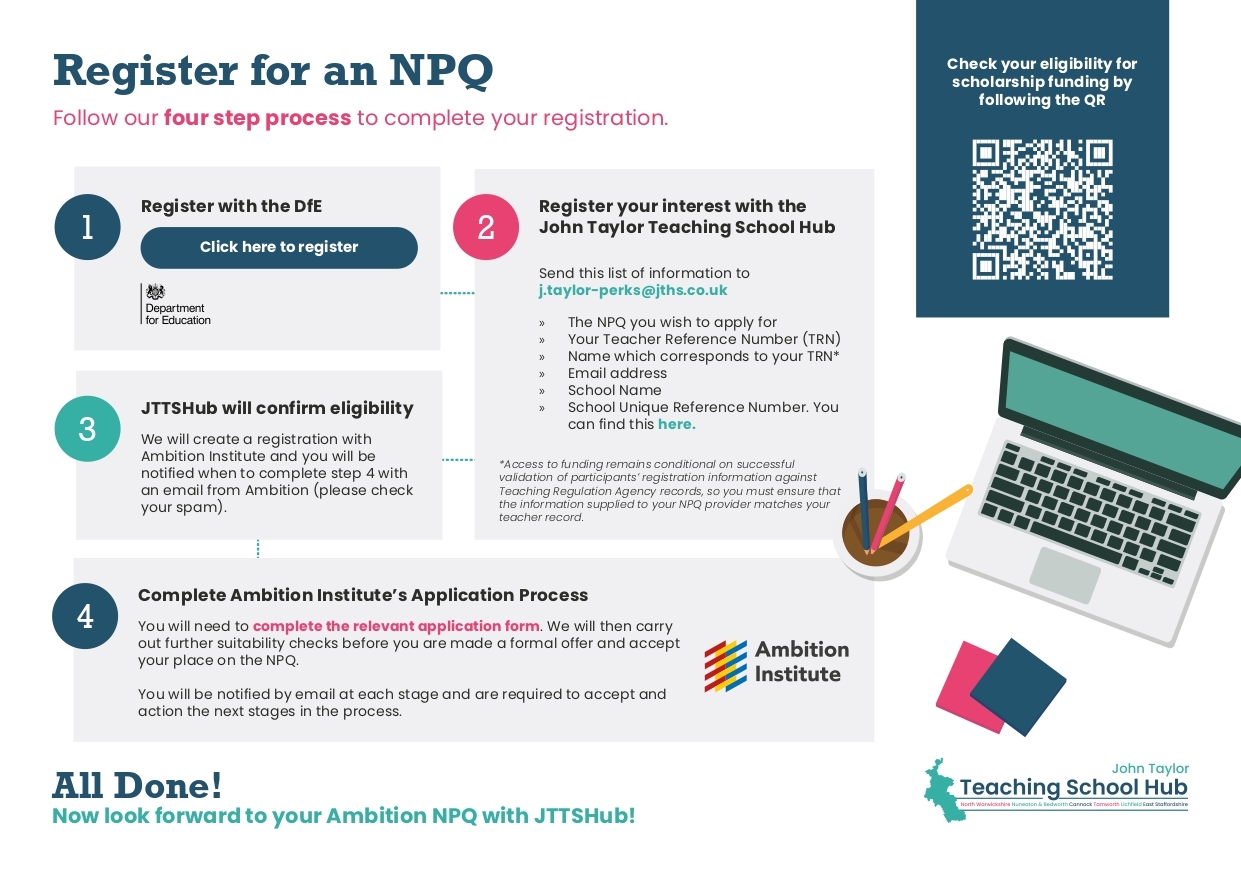 John Taylor Teaching School Hub have partnered with Ambition Institute to deliver NPQs. There are 4 Specialist and 4 Leadership National Professional Qualifications, and an additional support offer for Headteachers.